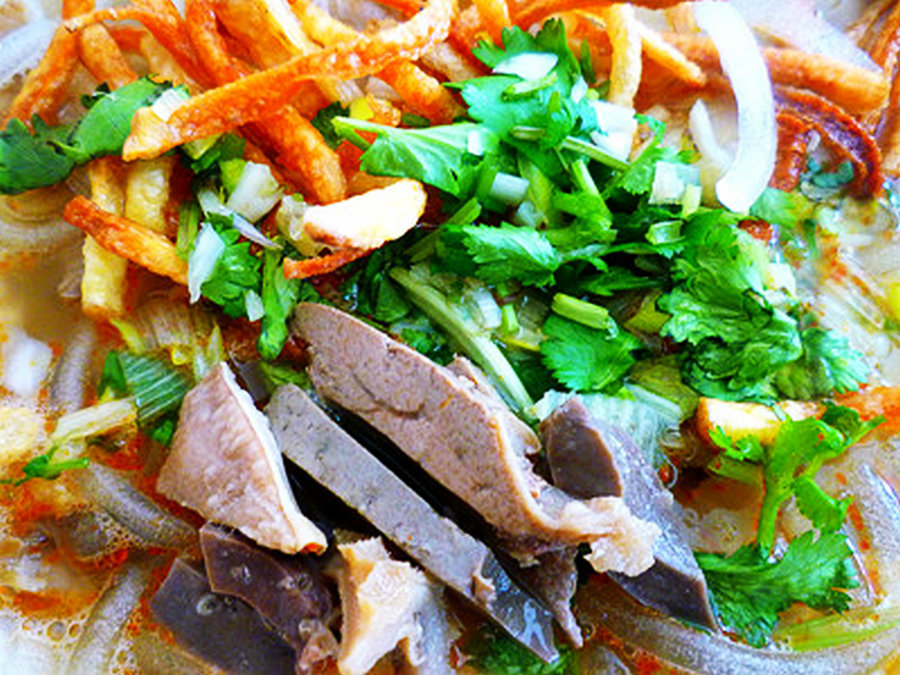 榆林的羊杂碎既不像南方人吃的羊杂汤那样肉少汤多,也不像内蒙人吃的羊杂碎,碗里面全是肉。简单一点说,榆林的羊杂碎就是一锅加了一些羊骨汤、极少量炒好的羊杂碎以及一些土豆丝和土豆粉条,最后加一点炸土豆丝和炸豆腐丝的烩粉汤,就这样一种不起眼的小吃,却变成了榆林人的最爱。