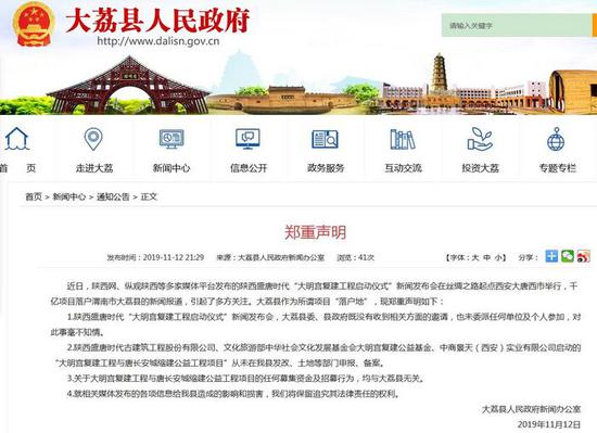大荔县人民政府新闻办公室指出,陕西盛唐时代古建筑工程股份有限公司、文化旅游部中华社会文化发展基金会大明宫复建公益基金、中商景天(西安)实业有限公司启动的“大明宫复建工程与唐长安城缩建公益工程项目”从未在本县发改、土地等部门申报、备案。