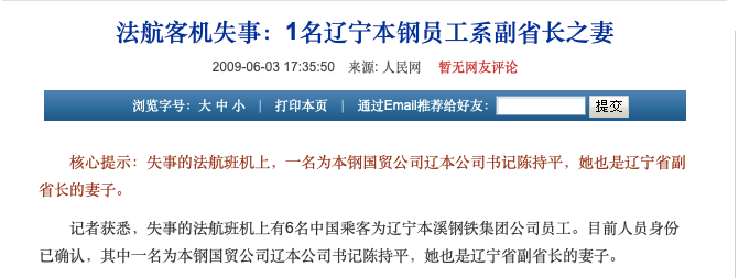 法航飞机失事事件导致9名中国公民遇难,其中6人来自本钢,刘国强之妻即在6人之中。