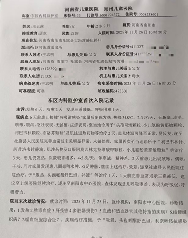2025年11月24日晚6点多,又去社旗县医院住院。25日又做血常规检查,检查结果血的指标到了危急值,诊断浓毒血症,紧急转院南阳中心医院,中心医院重症监护室检查发现呼吸衰竭,多器官感染受损严重;26日又转河南省儿童医院,又在重症监护室抢救8天,才抢救过来,确诊eb病毒感染性噬血细胞综合征,凝血功能异常,多器官感染受损。
