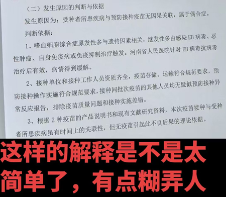现在距离孩子发病已有两个多月,疫苗问题得不到解决,县卫健委诊断为偶合症,我们肯定是不认可的。孩子打疫苗前非常健康的一个人,打完疫苗人几天就毁了。我们多方询问和了解查询相关资料,病因应该是这样的,当身体免疫系统出现问题,自然就激活了体内的eb病毒。当医生也都知道,嗜血细胞综合征也是免疫系统出现问题才容易引起的,这么简单的一个问题,卫健部门却不知道,定性为偶合,这不是要我们孩子的命吗?